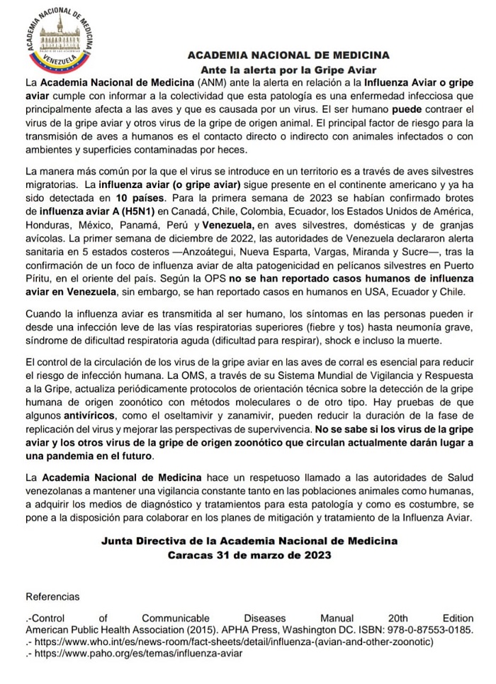 El comunicado realizado en Caracas, el 31 de marzo reseña: “La Academia Nacional de Medicina hace un respetuoso llamado a las autoridades de Salud venezolanas a mantener una vigilancia constante tanto en las poblaciones animales como humanas, a adquirir los medios de diagnóstico y tratamientos para esta patología y como es costumbre, se pone a la disposición para colaborar en los planes de mitigación y tratamiento de la Influenza Aviar”.