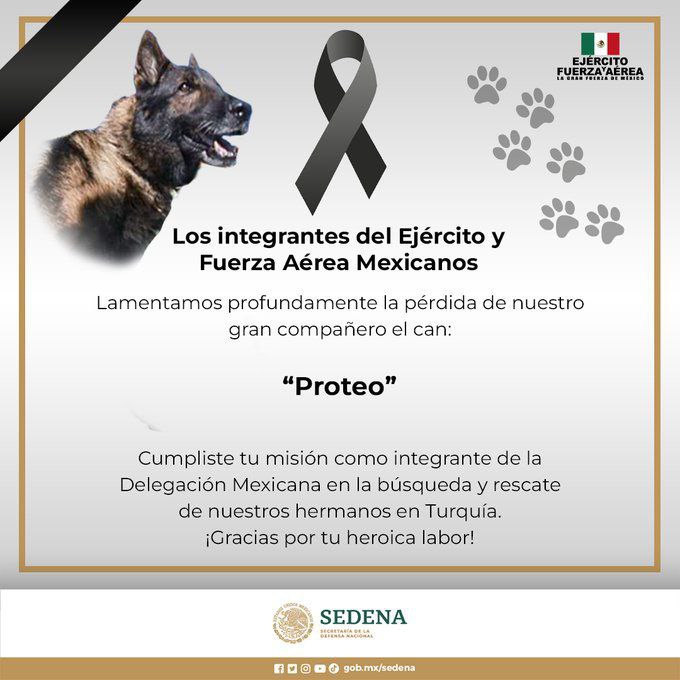 Este domingo, la Secretaría de la Defensa Nacional (Sedena) anunció el lamentable deceso de Proteo, un perrito de raza Pastor Alemán quien falleció en el cumplimiento de su labor por rescatar a sobrevivientes en los lugares del sismo.