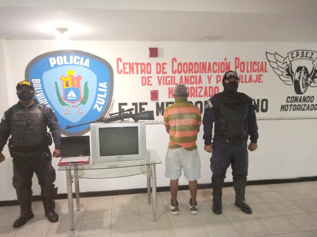 En el lugar de los hechos, los oficiales incautaron un televisor de 20 pulgadas, una computadora portátil y el rifle estilo deportivo de fabricación industrial, sin serial visible, el cual fue utilizado por el detenido para amedrentar a las víctimas.
