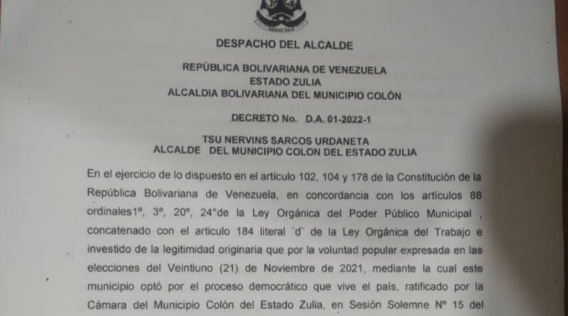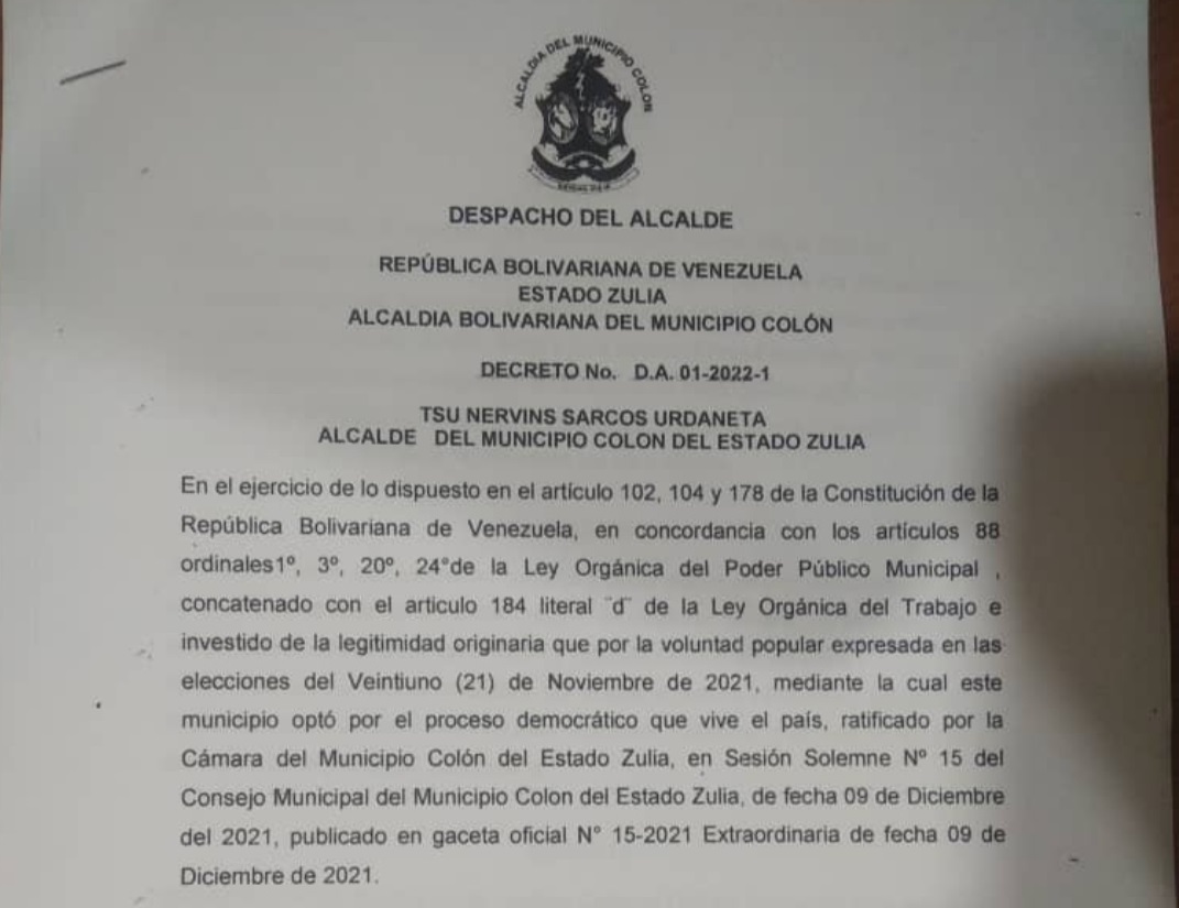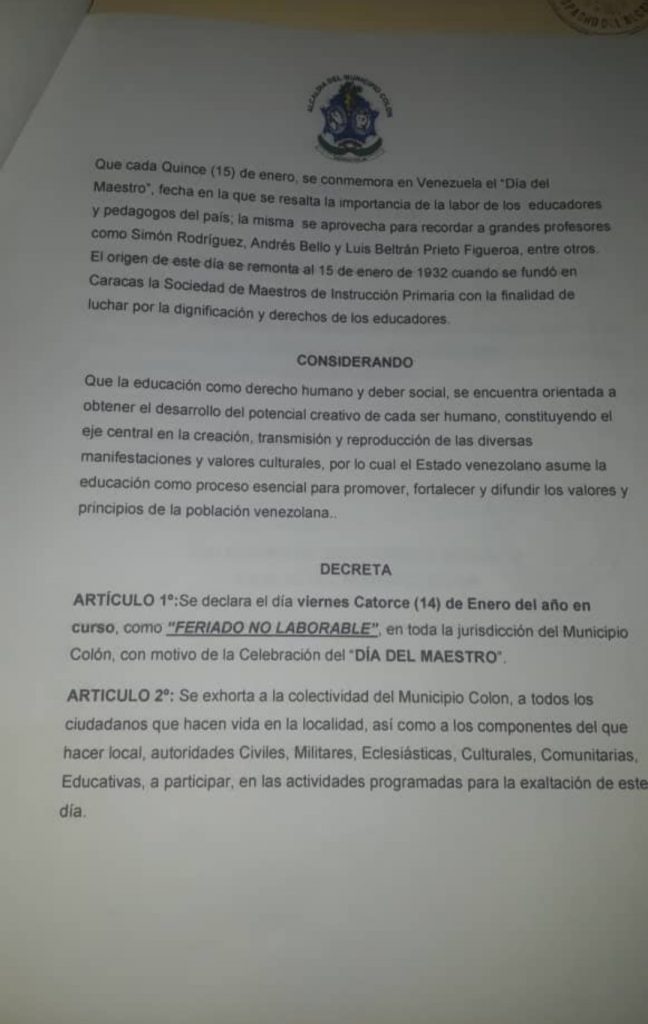 En uso de sus atribuciones legales, el alcalde del municipio Colón, estado Zulia, decretó este viernes 14 de enero en esa jurisdicción, a propósito del Día del Maestro en Venezuela.