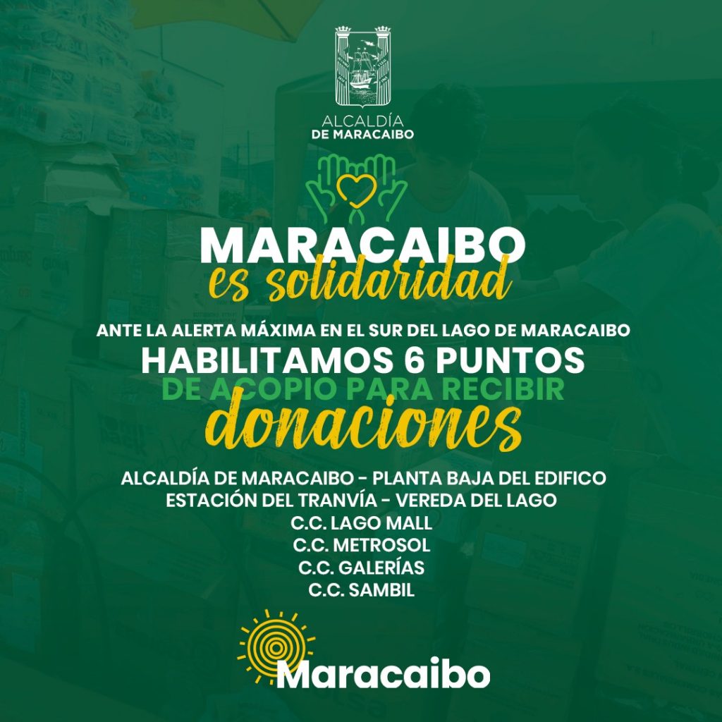 Luego de la “alerta máxima” decretada por el gobernador del Zulia, Manuel Rosales, por las fuertes lluvias que, en los últimos días, han afectado a los cinco municipios del Sur del Lago, la Alcaldía de Maracaibo se solidariza con sus pobladores y activó, desde este miércoles 27 de abril, seis puntos de recolección de apoyo y donaciones.