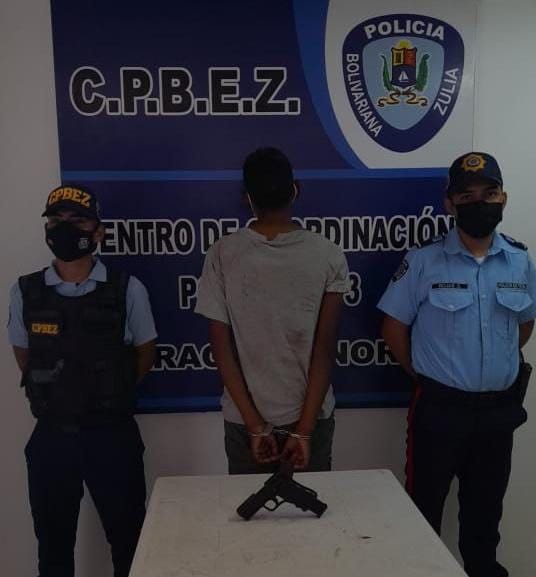 Patrulleros del Centro de Coordinación Policial Maracaibo Norte, arrestaron en plena avenida 16 Guajira a Leonardo Jenny Araujo Pirela de 28 años de edad, quien caminaba por la vía pública con un arma de fuego en la mano, así lo informó el CJ Sergio Villasmil Rondón director general del Cuerpo de Policía del estado Zulia (Cpez).