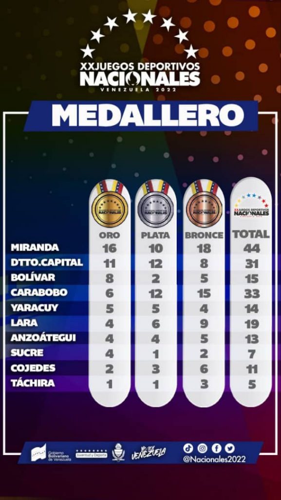 Así va el medallero de los Juegos Nacionales 2022: Miranda continúa en la cima del medallero de los Juegos Nacionales 2022