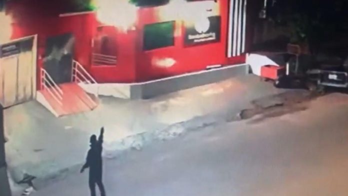 Imágenes grabadas por las cámaras de vigilancia registraron el momento en que un hombre vestido de negro y con capucha se acerca a la sede, mira para ambos lados de la calle y dispara sin freno en varias oportunidades para después abandonar el lugar.