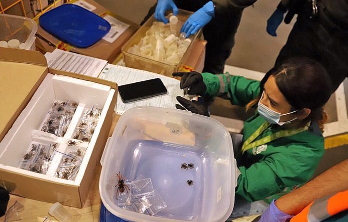 Eran 232 arañas, un escorpión con 7 crías, 9 huevos de araña y 67 cucarachas las que iban camufladas en 210 recipientes plásticos, entre cocas y rollos fotográficos.