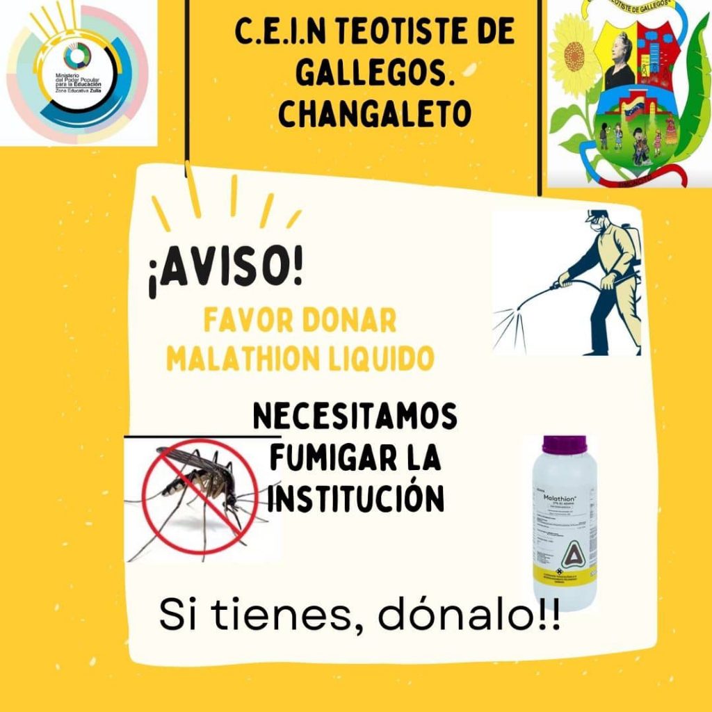 Ante la presencia de gran cantidad de zancudos, patas blancas en los salones de clases y espacios abiertos de la Unidad Educativa “simoncito” Teotiste De Gallegos, ubicada en la parroquia Rómulo Gallegos del municipio Sucre del estado Zulia, personal directivo solicita a las autoridades gubernamentales y sanitarias la pronta fumigación de las áreas a fin de evitar cualquier brote de dengue o paludismos entre los estudiantes y docentes.