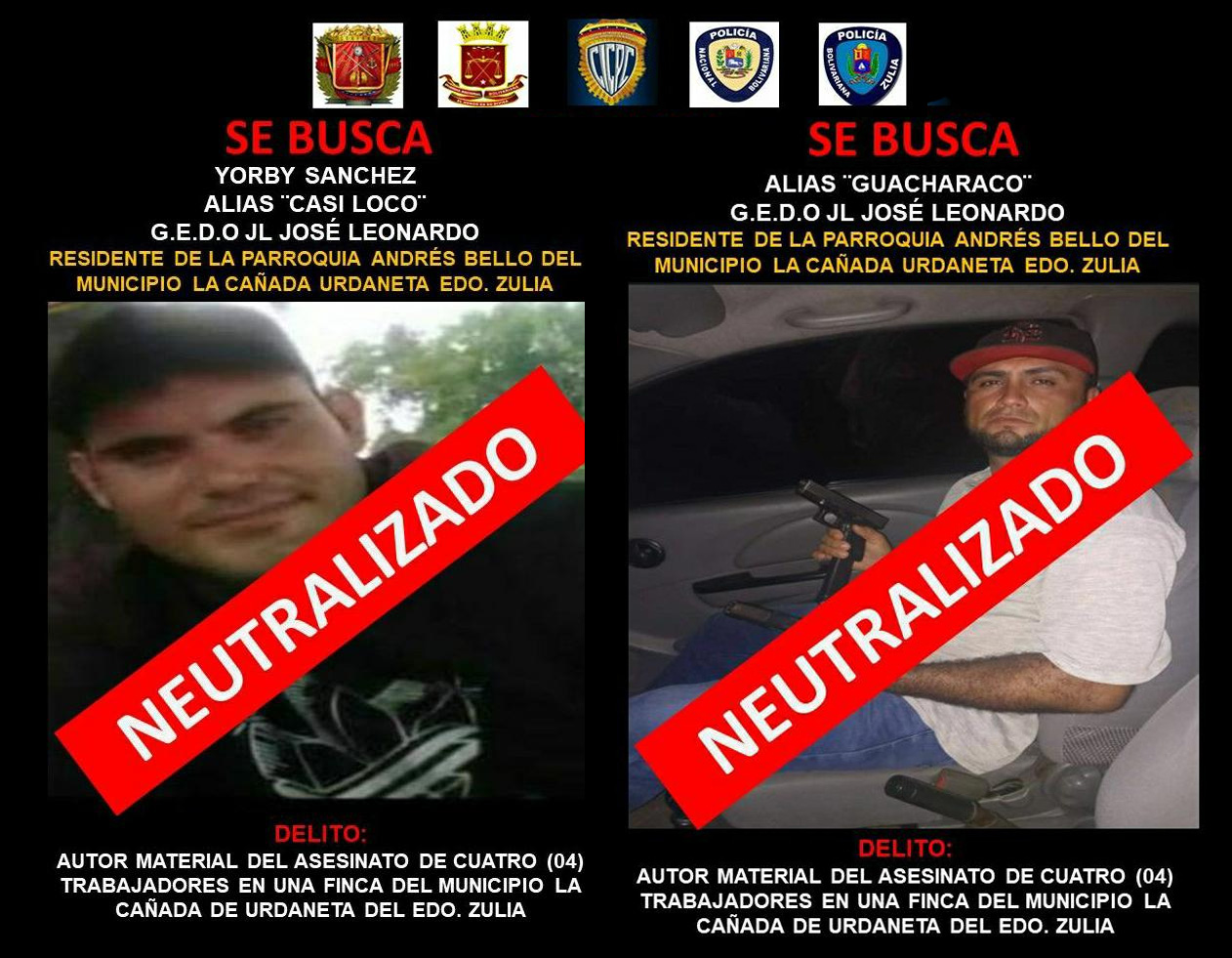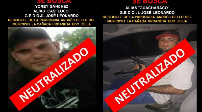 .Uno de los abatidos quedó identificado como Yorby José Sánchez Bravo, conocido como Casi Loco, mientras que el otro caído sólo es señalado con el apodo de “Guacharaco”, quienes pertenecen a una banda de extorsión “JL”.