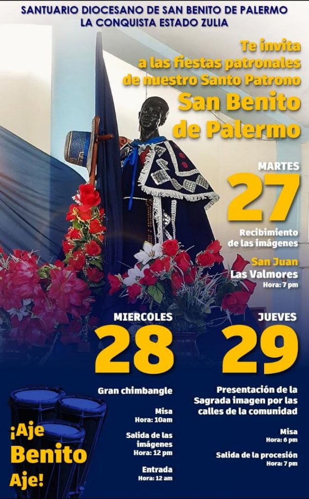 Para los días 27, 28 y 29 de diciembre se estarán desarrollando un cronograma de actividades organizado por el Santuario Diocesano San Benito de Palermo, La Conquista, dónde para este martes 27 desde las 7 de la noche tendrán el recibimiento de las imágenes, posteriormente, el miércoles 28 se llevará a cabo el gran chimbangles, misa y salida de las imágenes.