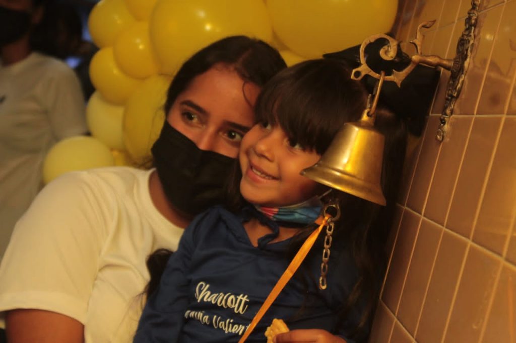 Marián Fernández, Madre de Sharlotte Romero afirmó que al inicio del diagnóstico estuvo junto a su hija 38 días hospitalizadas y al saber que habían más pacientes con una patología igual que el de su hija, se llenó de fuerzas y se aferró a la oración, para poder salir victoriosa junto a su hija y hoy fue el día más esperado por su familia, porque ha tocado la campana de la salud, la campana de la victoria.