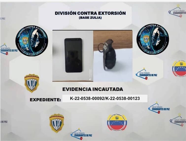 Al momento de la captura, se le incautó la granada y un celular, el cual, al ser sometido a las experticias correspondientes, se comprobó el atentado que pretendía cometer contra el negocio en mención; además, su vinculación con el referido grupo hamponil.