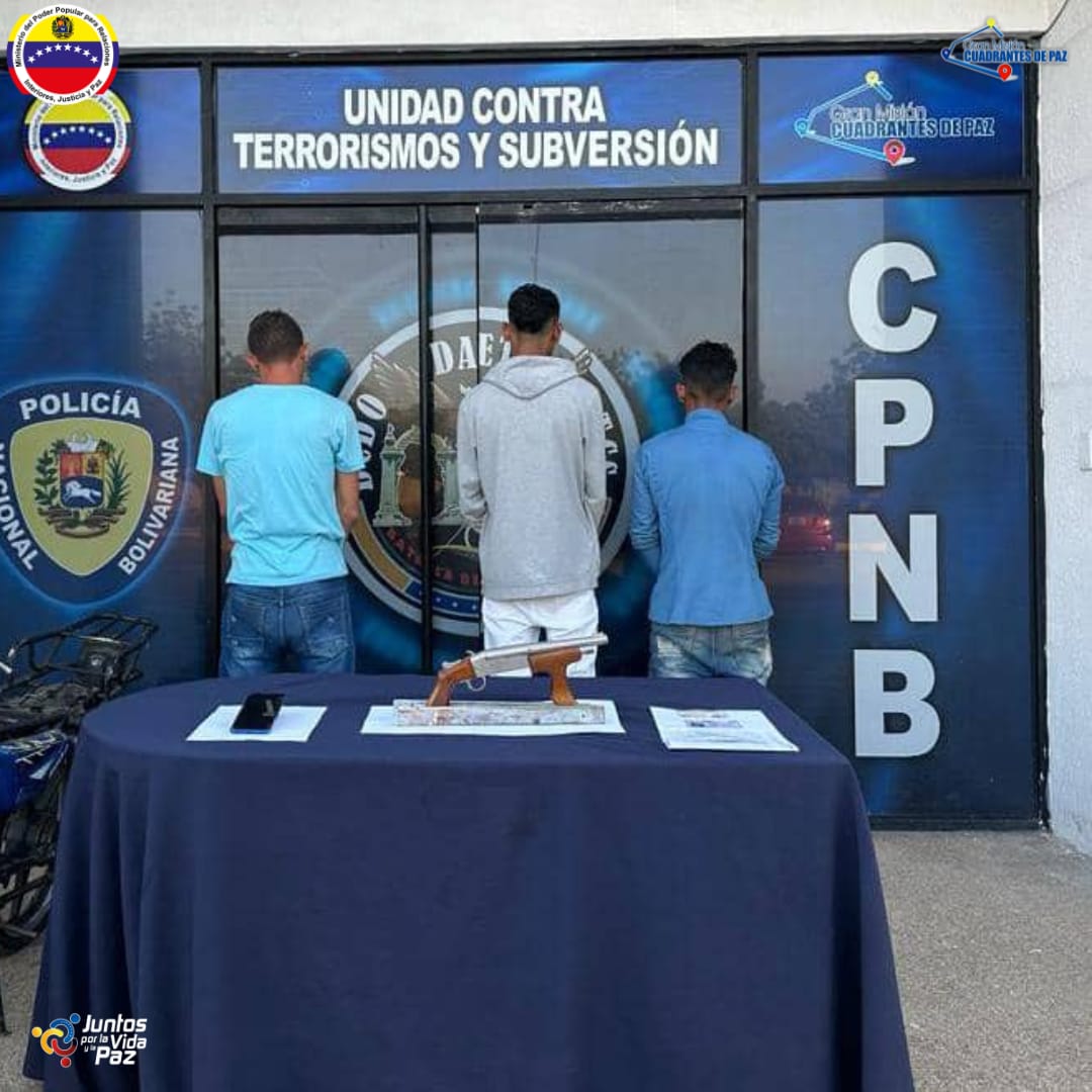 El procedimiento se realizó en el sector Carabobo de la parroquia Domitila Flores, municipio San Francisco, durante un dispositivo de búsqueda y captura, donde una comisión de la Unidad Contraterrorismo y Subversión logró la aprehensión de Pedro Díaz (31), alias “Pedrito”, quien presentó historial policial por el delito de robo genérico, Yoglis Pirela (32), alias “Calvin Klein”, solicitado por el sistema #Siipol, y Cristian García (22), alias “El Peluca”, todos integrantes del Grupo Estructurado de Delincuencia Organizada (GEDO) “El Yiyi”, dedicados al robo, extorsión y señalados por la comunidad como azotes de barrio.