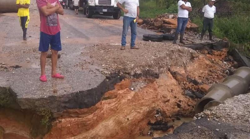 El constante flujo de agua, producto del desbordamiento de ríos, hizo que la carretera cediera en el sector Cumbres de Catatumbo, cercano a la alcabala de Aricuaizá.