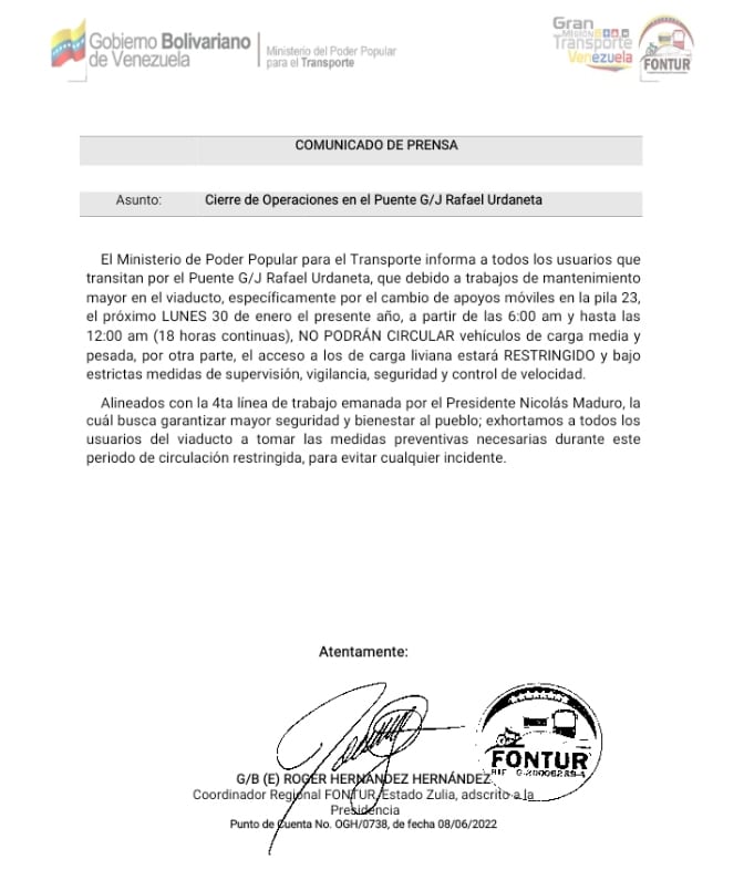 Autoridades del Fondo Nacional de Transporte Urbano (Fontur), informaron a través de sus redes sociales en Instagram y Twitter sobre el cierre del puente Rafael Urdaneta, debido a trabajos de mantenimiento mayor en el viaducto, pautados para este lunes 30 de enero desde las 6.00 am hasta las 12.00 am (18 horas continuas).