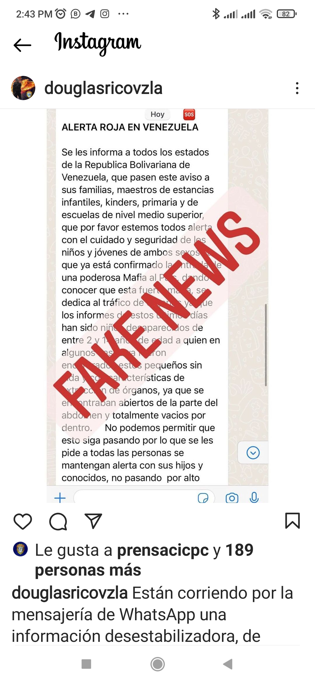 Cicpc desmiente mensaje que circula por WhatsApp sobre secuestro de niños y tráfico de órganos.