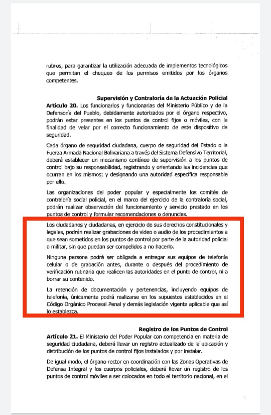 «Ninguna persona podrá ser obligada a entregar sus equipos de telefonía celular o de grabación antes, durante o después del procedimiento de verificación rutinaria que realicen las autoridades en el punto de control, ni a borrar su contenido», se lee en el artículo 20.