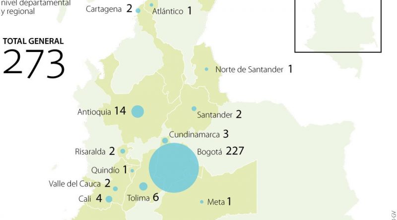 Los casos están distribuidos en: Bogotá, Antioquia, Tolima, Risaralda, Cali, Cartagena, Cauca, Cundinamarca, La Guajira, Santander Valle del Cauca, Quindío, Norte de Santander, Barranquilla y Atlántico.