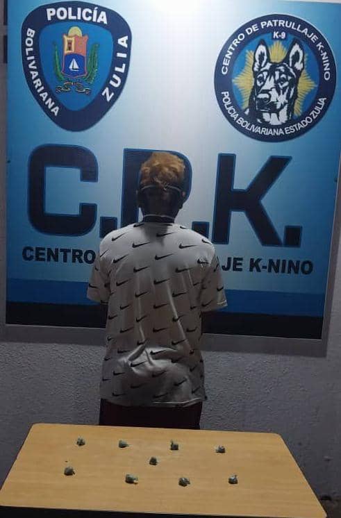 Informó el CJ Roberto Antonio Alfaro Molinares, director general del Cuerpo de Policía del estado Zulia (CPEZ), que la comisión del Centro de Patrullaje K-nino (CPK), aprehendió en primer lugar a Eduardo José Medina, de 20 años de edad, a quien le encontraron nueve envoltorios con nueve gramos de presunta marihuana.