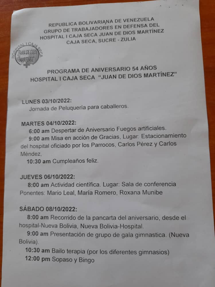 A propósito de cumplirse los 54 aniversario del Hospital I Juan de Dios Martínez de Caja Seca, municipio Sucre-Zulia, el personal administrativo, gremio médico y enfermeros tienen previsto realizar una serie de actividades que se iniciarán este próximo lunes 3 de Octubre.