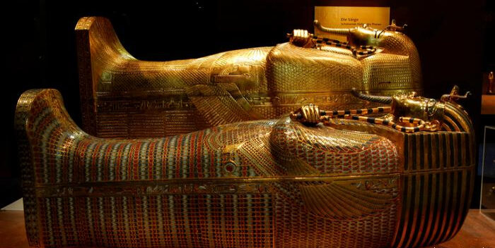 Ataúdes magníficos y cantidades enormes de oro fueron encontrados en la cámara funeraria de Tutankamón. Los ataúdes de la imagen parecen engañosamente reales, pero en realidad son réplicas. Más de 1.000 objetos han sido reproducidos para mostrar cómo eran las cámaras funerarias del faraón.