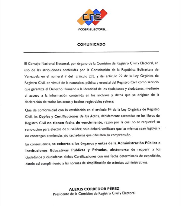 En el documento publicado, el CNE aclara a los ciudadanos que, solo si las copias y certificaciones presentan alguna enmienda o que no estén legibles, deberán ser renovadas.