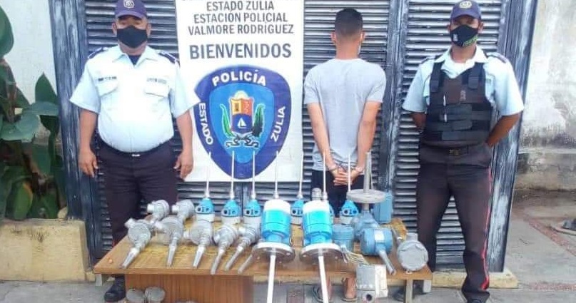 La primera aprehensión se efectuó en el callejón Taparito, parroquia La Victoria, municipio Valmore Rodríguez, donde los oficiales notaron la presencia de Juan José Primera Rojas de 31 años de edad, quien ante la comisión quiso evadirse, por lo que fue abordado incautándole tres suiches de presión, un transmisor de presión diferencial, seis transmisores de nivel, un manómetro 0300 PSI 5, un transmisor de temperatura, 47 termocuplas indicadores de temperatura de la compañía petrolera, al solicitarle alguna permisología o guía de traslado manifestó no poseerla.