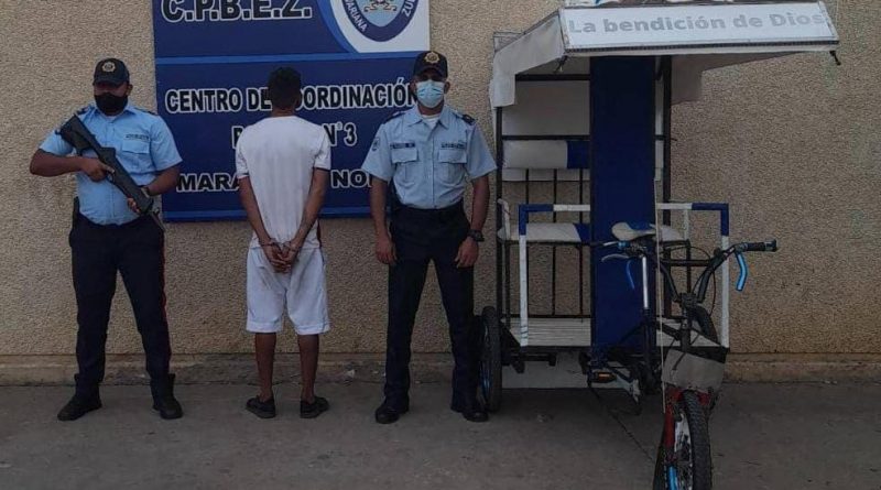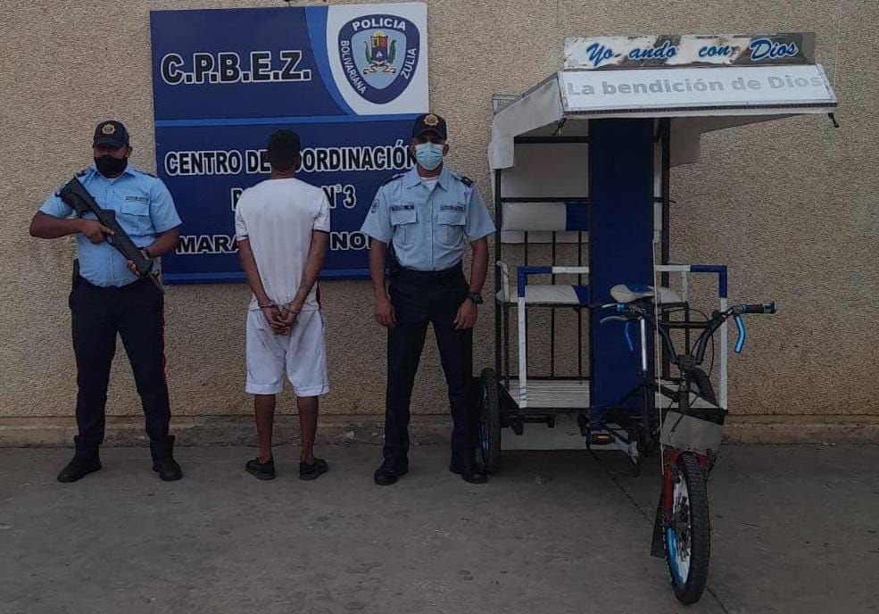 En el Boulevard Rafael Urdaneta, parroquia Chiquinquirá, municipio Maracaibo, agentes del Centro de Coordinación Policial Maracaibo Norte, arrestaron a Moisés David Iguarán Nava de 22 años de edad, quien solicitó el servicio de ciclotaxi para el sector La Pícola, cuando ya habían recorrido una gran distancia el pasajero simulando tener un arma de fuego despojó al joven taxista del vehículo de atracción humana.