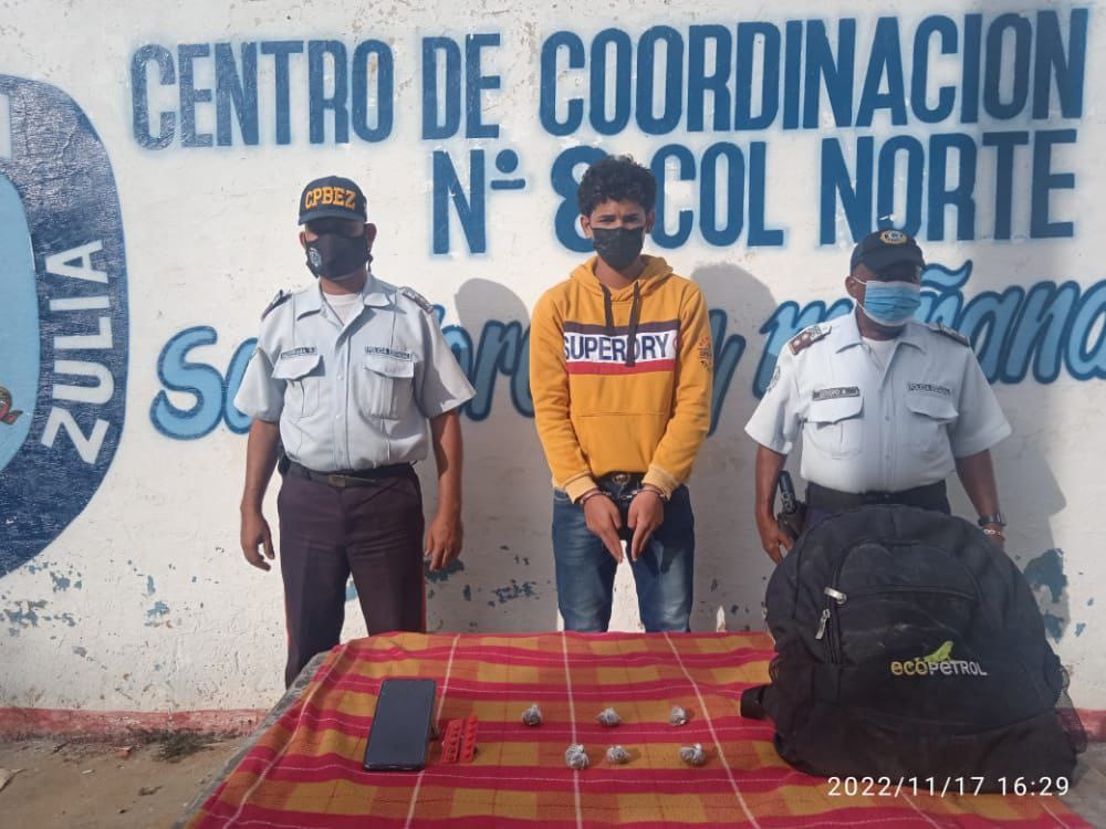 El C/J Sergio Villasmil Rondón, director general del Cuerpo de Policía del estado Zulia (Cpez), identificó al elemento como Leonel Nikol Barboza Carrillo de 18 años de edad, el cual tenía en su poder 13.4 gramos del restos vegetales y el medicamento antipsicotico.