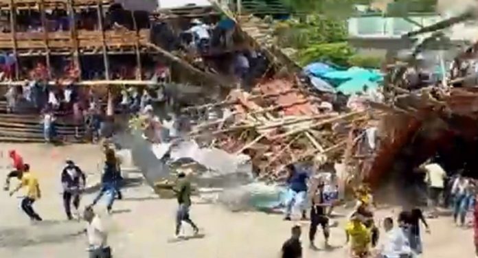 En los videos publicados en las redes sociales, se ve como durante una corraleja -como se conoce a las fiestas populares de toros en Colombia- se desplomó una tribuna de madera que estaba atestada de gente, pese a que no se veía muy sólida.