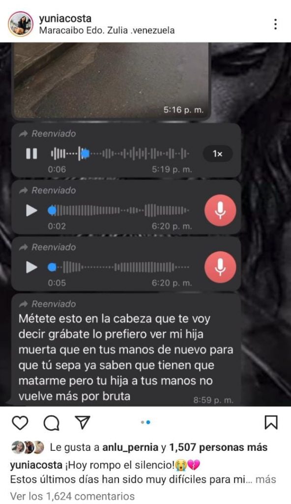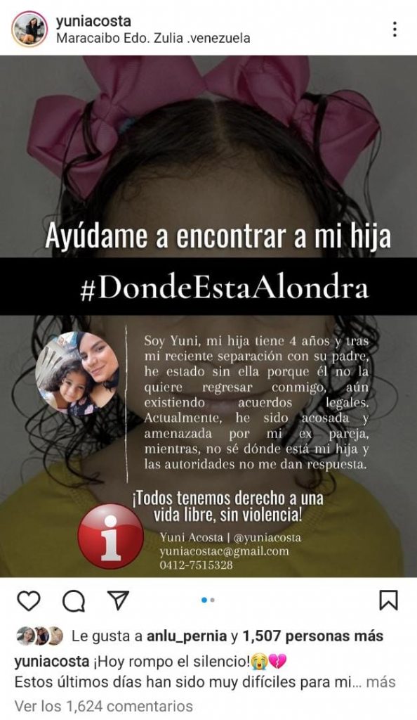 “Estos últimos días han sido muy difíciles para mí. Me llena de tristeza e impotencia comunicarles que mi hija está desaparecida desde el pasado sábado 16 de abril. Su padre, mi ex pareja se niega a entregármela (No sé dónde la tiene) tras nuestra separación. Confieso que he recibido fuertes amenazas por parte del Señor Luis Oberto Fernández Márquez”. Parte de lo que denunció la comunicadora a través de las redes sociales.