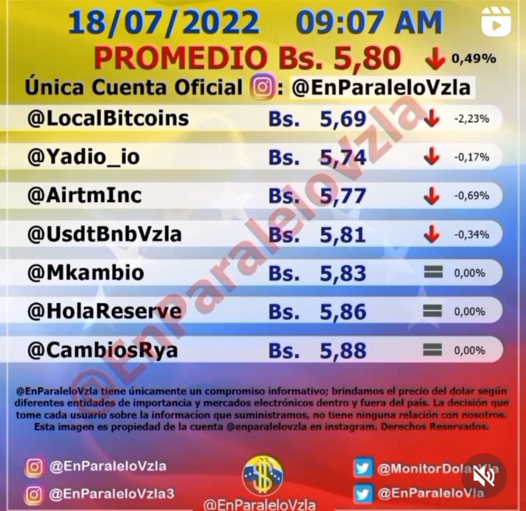 De acuerdo @enparalelovzla los precios oscilan entre un mínimo de 5,69 bolívares y un máximo que se mantiene invariable en 5,88 bolívares por dólar.