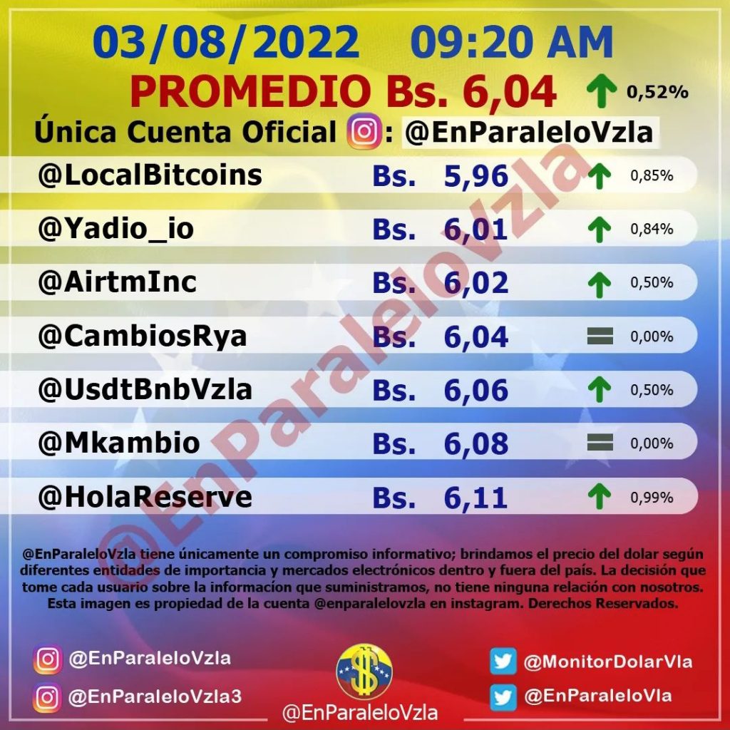 De acuerdo @enparalelovzla los precios oscilan entre un mínimo de 5,96 bolívares y un máximo en 6,11 bolívares por dólar.