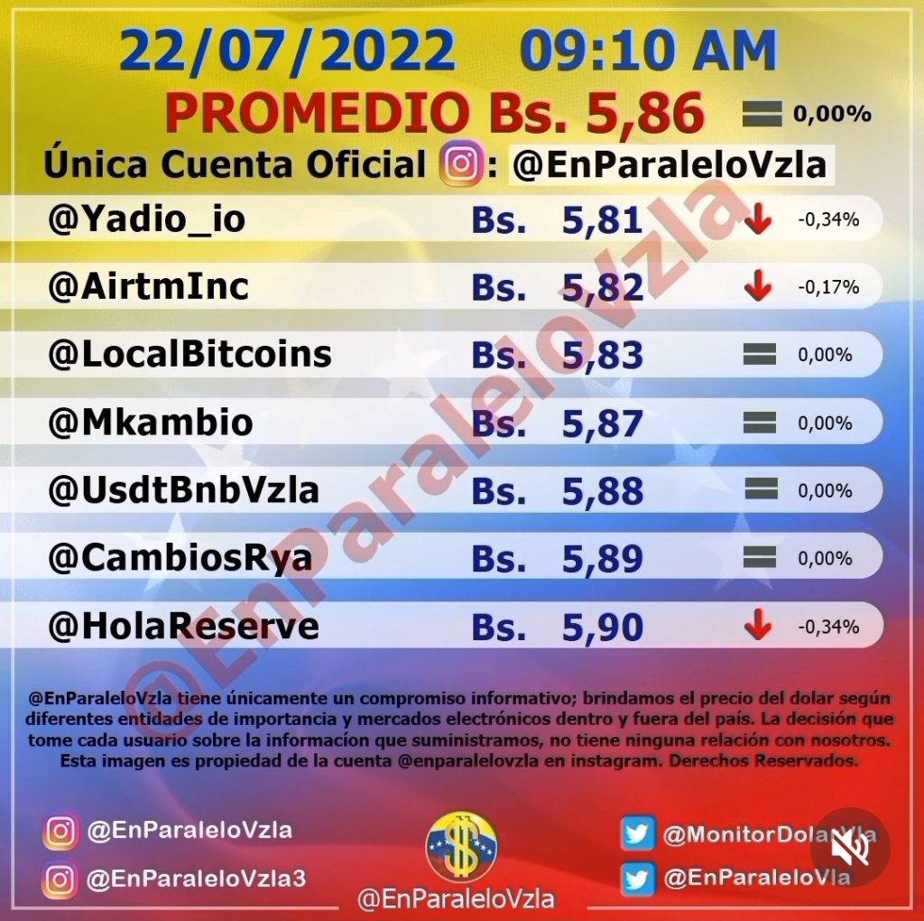De acuerdo @enparalelovzla los precios oscilan entre un mínimo de 5,81 bolívares y un máximo en 5,90 bolívares por dólar.