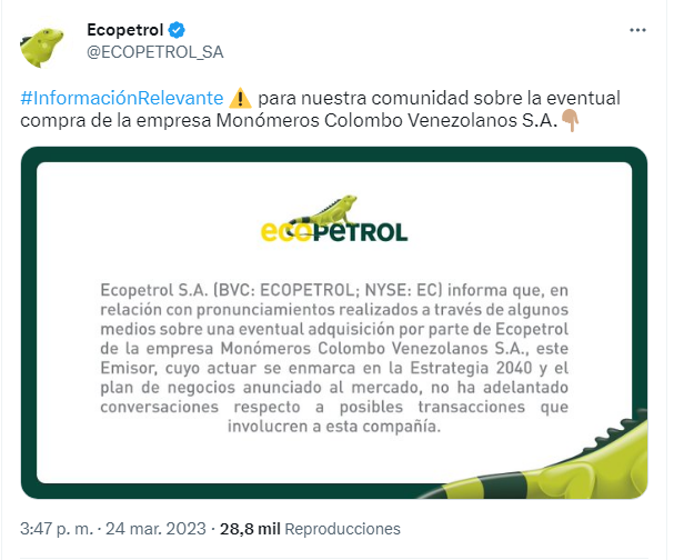 “Ecopetrol S.A. (Bvc: Ecopetrol: Nyse: Ec) informa que, en relación con pronunciamientos realizados a través de algunos medios sobre una eventual adquisición por parte de Ecopetrol de la empresa Monómeros Colombo Venezolanos S.A., este emisor, cuyo actuar se enmarca en la Estrategia 2040 y el plan de negocios anunciado al mercado, no ha adelantado conversaciones respecto a posibles transacciones que ‘involucren a esta compañía’”, dijo la compañía a través de Twitter.