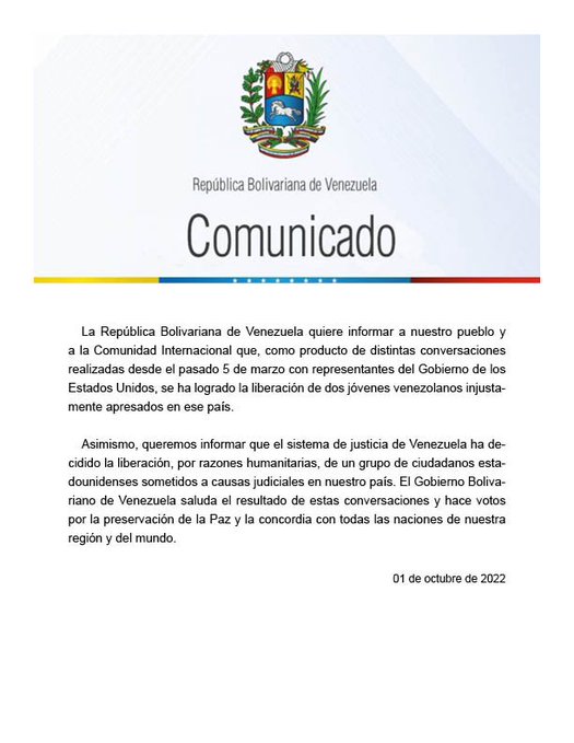 «Se ha logrado la liberación de dos jóvenes venezolanos injustamente apresados en ese país», señala el comunicado emitido por el chavismo sin especificar que se trata de los sobrinos Flores.