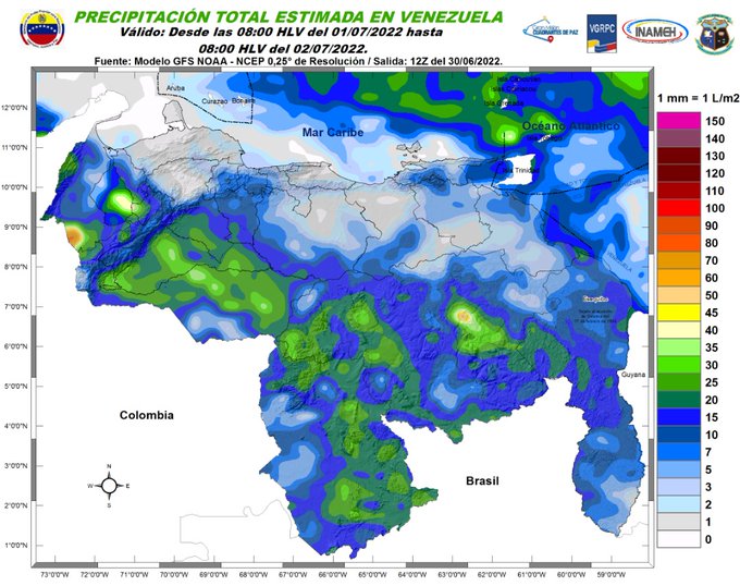 El organismo indicó en su reporte diario de Twitter que igualmente se esperan lluvias en Zulia, Los Andes, Llanos Occidentales y Centrales, Amazonas, Bolívar y el Esequibo.