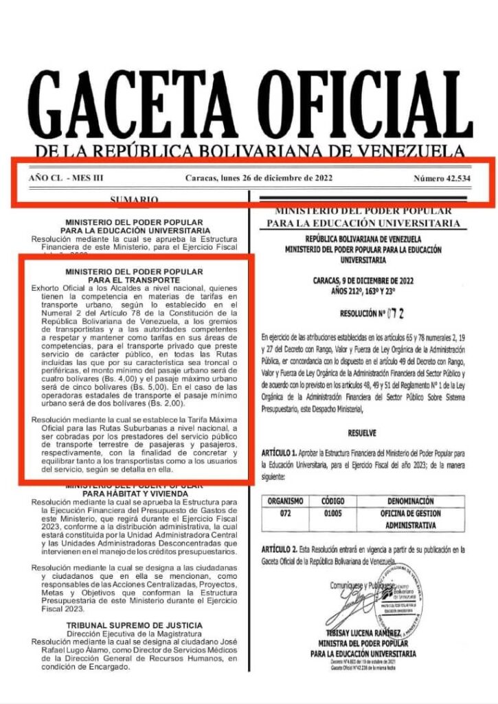 Según la Gaceta Oficial 42.534 de fecha 26 de diciembre de 2022, quedó establecido que el monto mínimo del pasaje urbano será de cuatro bolívares (Bs. 4,00) y el pasaje máximo urbano será de cinco bolívares (Bs. 5,00), bien sean ruta troncal o periféricas.
