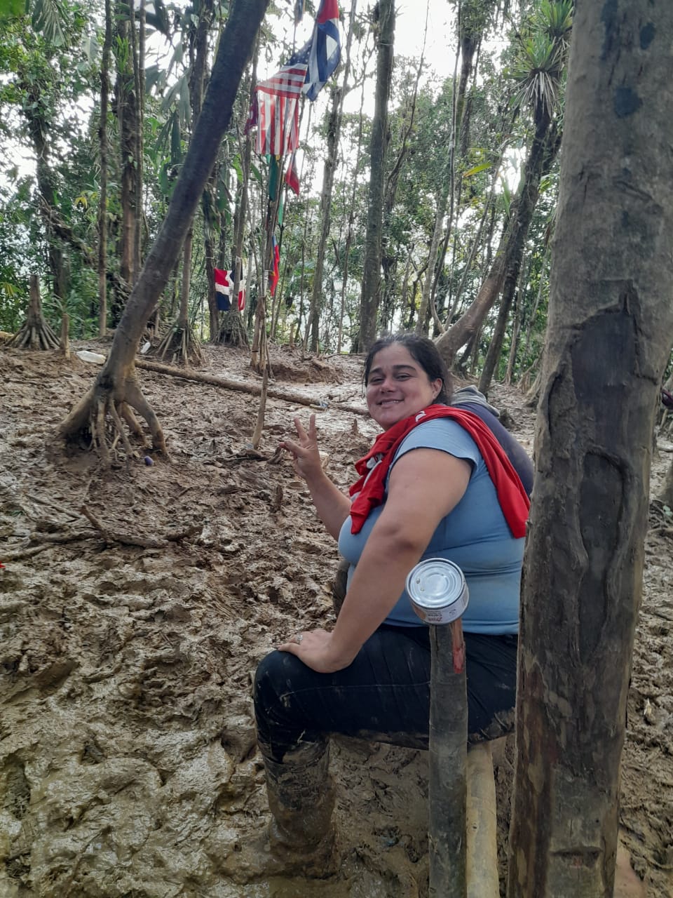 Crístofer Báez se toma una foto en medio del charco de la Selva del Darién mientras espera a Yriamar quien había tenido dificutad para subir la loma,