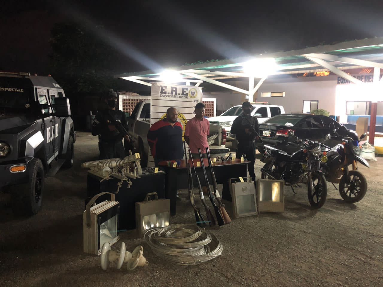 Una comisión del Equipo de Respuesta Especial (ERE) del Cuerpo de Policía del estado Zulia (Cpez), dio captura a dos elementos a quienes se les seguía la pista por dedicarse a sabotear el sistema eléctrico, al momento de la detención se les incautó seis armas de fuego, guayas de alta tensión y tres vehículos.