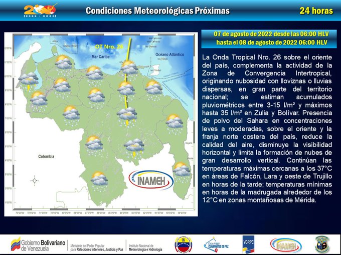 El Instituto Nacional de Meteorología e Hidrología informó que se registrarán lluvias o chubascos, algunos con descargas eléctricas (destellos azules) en áreas del Zulia, Mérida, Trujillo, Amazonas, Bolívar y el Esequibo.
