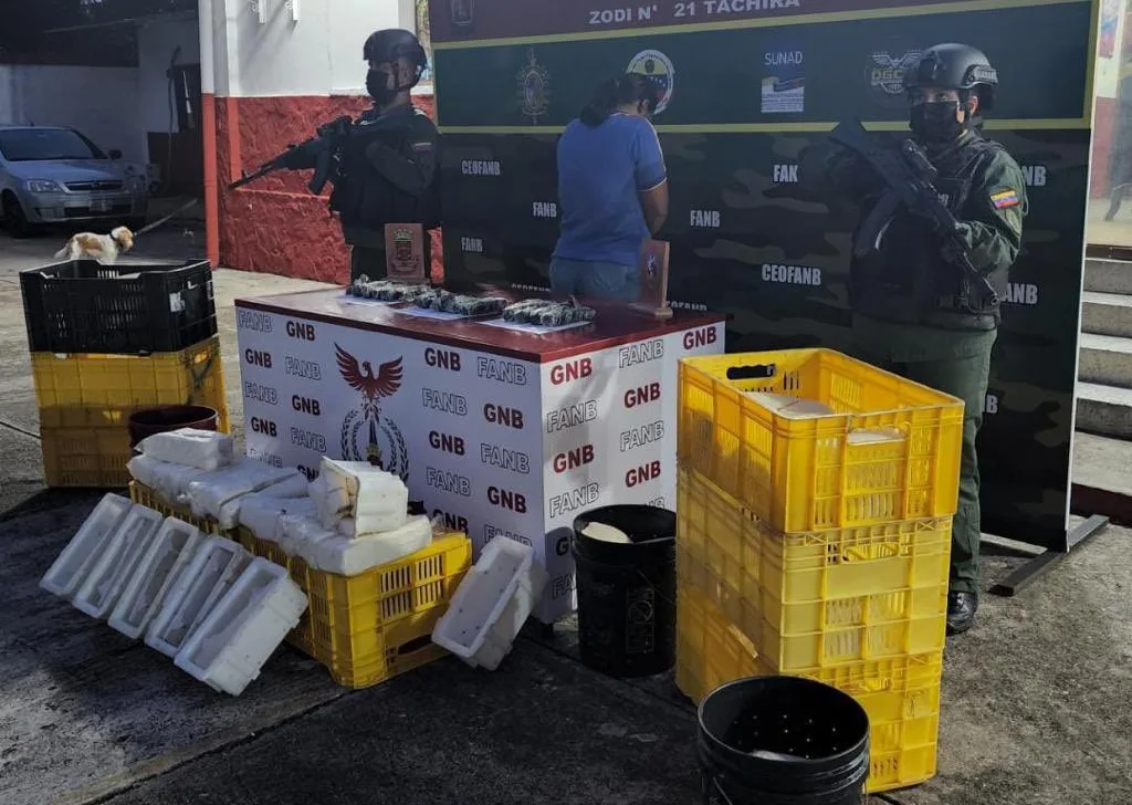Efectivos de la Fuerza Armada Nacional Bolivariana (FANB) realizaron la detención de una ciudadana con 12 bultos de marihuana, y de dos ciudadanos con cuatro panelas de cocaína envueltos en quesos, en el estado Táchira, informó el jefe del Comando Estratégico Operacional de la FANB (Ceofanb), Domingo Hernández Lárez.