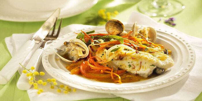 Paso 6. Hornea durante 10 minutos. Retira y reparte los filetes de rodaballo en cuatro platos. Hecha encima la juliana de verduras y las almejas. ¡Listo!