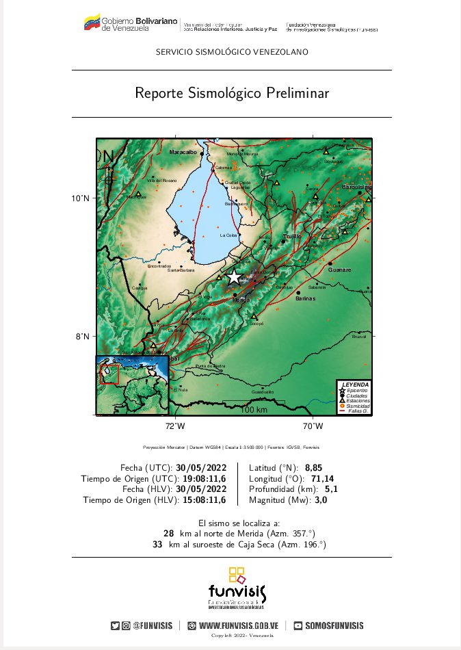 Fundación Venezolana de Investigaciones Sismológicas (Funvisis) reportó, este lunes 30 de mayo, un sismo de magnitud 3.0 en el estado Mérida.