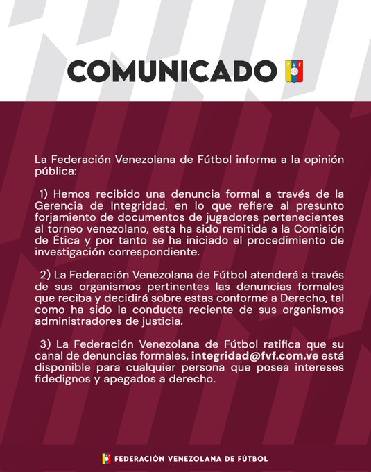 “La Federación Venezolana de Fútbol atenderá a través de sus organismos pertinentes las denuncias formales que reciba y decidirá sobre estas conforme a Derecho”, dice el comunicado, el cual también ratifica la disponibilidad de un canal de denuncias para estos casos.