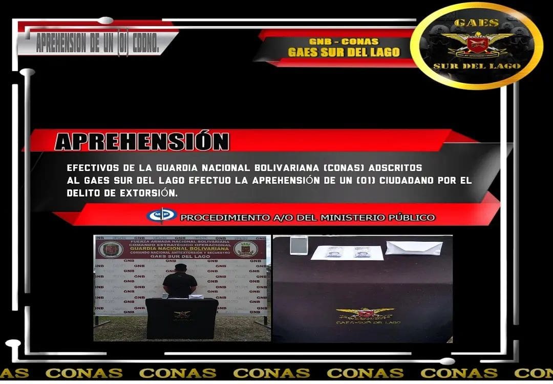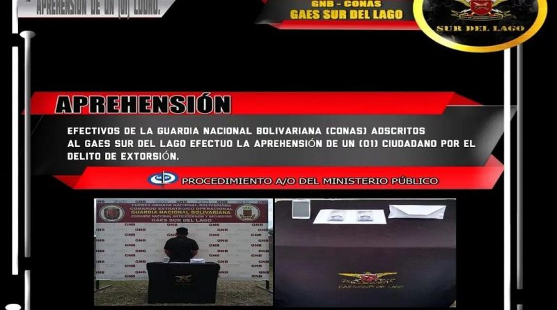 Comisión Integrada por Guardias Nacionales Bolivarianos adscritos al Grupo Anti-Extorsión y Secuestro Sur del Lago, lograron darle captura a un sujeto, que estaba siendo señalado por el delito de extorsión.