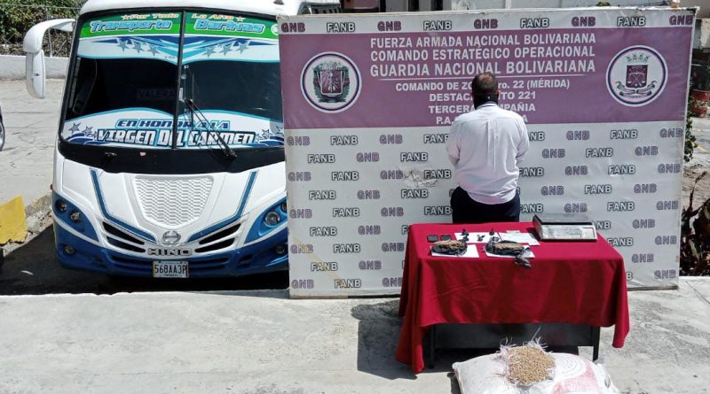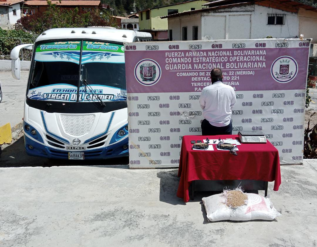 Los efectivos realizaron una requisa a una unidad de transporte público que cubría la ruta Mérida – Barinas, y lograron incautar dos envoltorios de marihuana con un peso bruto de 940 gramos y cinco envoltorios de material sintético, contentivos de base de cocaína, con un peso de 55 gramos. La droga era transportada en un saco de alimentos para puercos.