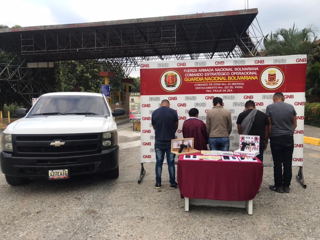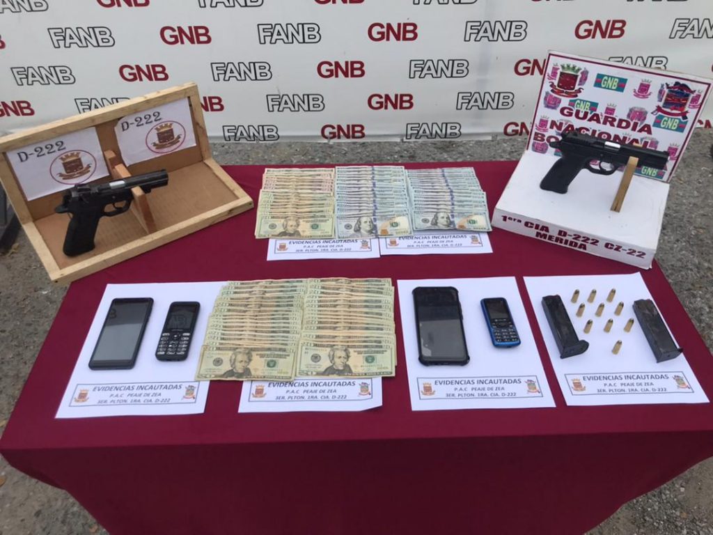 Con dos pistolas 9 milímetros y más de 6 mil dólares en efectivo fueron atrapados 5 individuos por la Guardia Nacional Bolivariana en el Punto de Atención al Ciudadano (PAC) peaje Zea. Así lo dio a conocer el G/B Hernán Dionisio Rincón Paz, comandante de Zona 22 de la GNB en esta entidad andina.