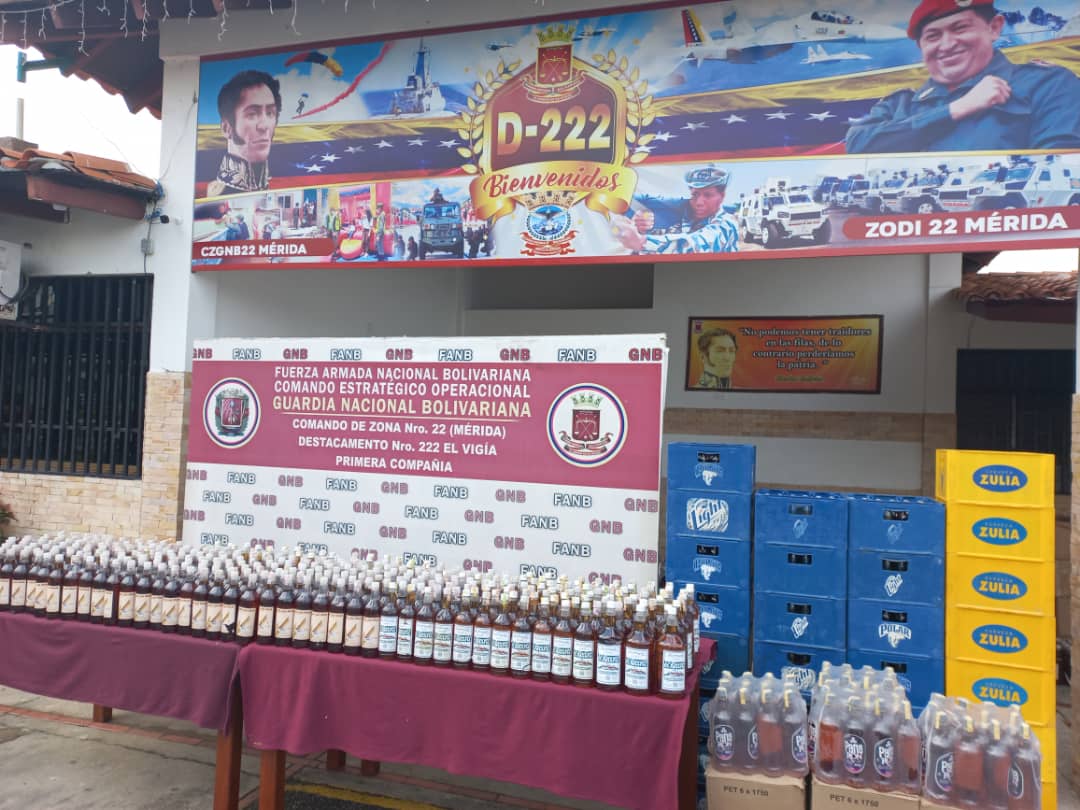 Efectivos de la GNB logran la retención de casi 2000 litros de especies alcohólicas en el sector La Blanca, parroquia Pulido Mendez, municipio Alberto Adriani, estado Mérida.Así lo dió a conocer el G/B Hernán Dionisio Rincón Paz, comandante de Zona 22 de la GBN en el estado Mérida.