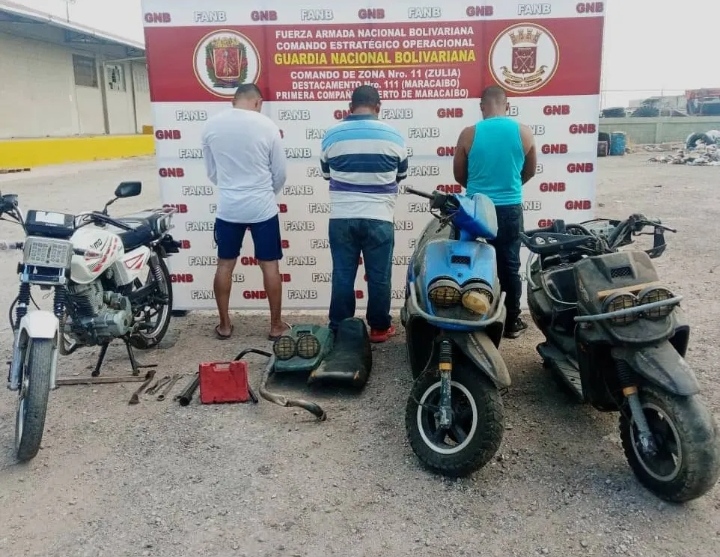 El primer caso fue reportado en el barrio Los Pescadores de la parroquia Coquivacoa, allí fueron detenidos Manuel Enrique Valero, José Miguel López y Angelo Pirela. Los dos últimos indocumentados. A los antisociales se les retuvieron 3 vehículos tipo motos, una caja de herramientas y varias partes de motocicletas ya desarmadas.