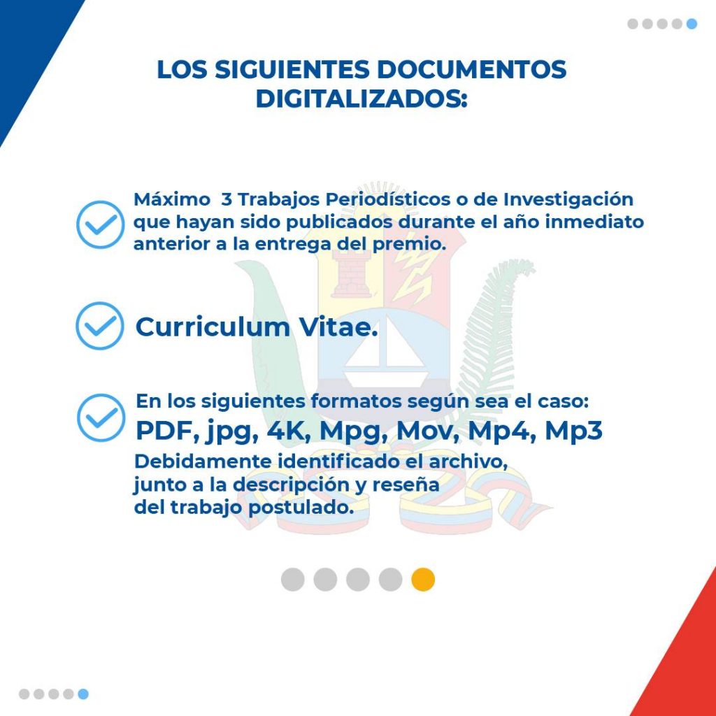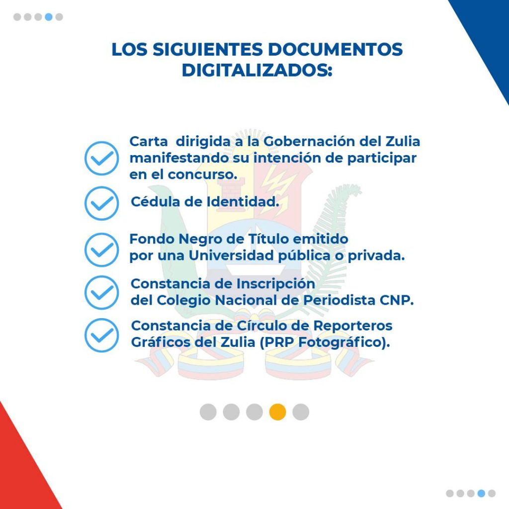 Reyes resaltó que los profesionales de la comunicación deberán consignar al correo *premioregionalperiodismozulia@gmail.com* los siguientes documentos digitalizados: *Carta dirigida a la Gobernación del Zulia manifestando su intención de participar en el concurso, *Cédula de Identidad, *Fondo Negro de Titulo emitido por una Universidad pública o privada, *Constancia de Inscripción del Colegio Nacional de Periodista CNP, *Constancia de Circulo de Reporteros Gráficos del Zulia (PRP Fotográfico).