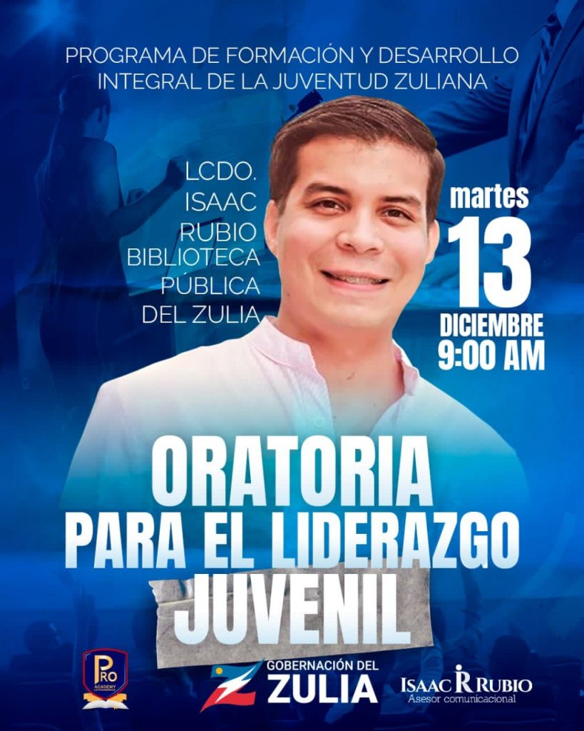 La Gobernación del Zulia, a través de la Secretaría de Atención Integral de la Juventud y la academia Pro Academy Latinoamérica, el profesor Isaac Rubio presentará la conferencia “Oratoria para el liderazgo juvenil’, este martes 13 de diciembre.